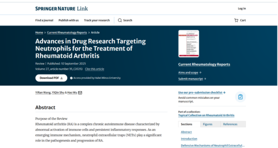 图1:《Advances in Drug Research Targeting Neutrophils for the Treatment of Rheumatoid Arthritis》发表在《Current Rheumatology Reports》期刊上并被PubMed收录