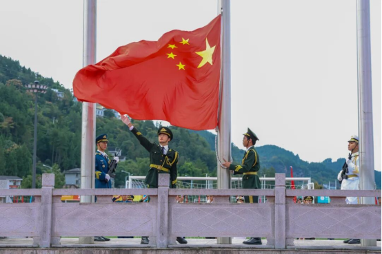 全体人员起立面向国旗行注目礼,奏唱中华人民共和国国歌