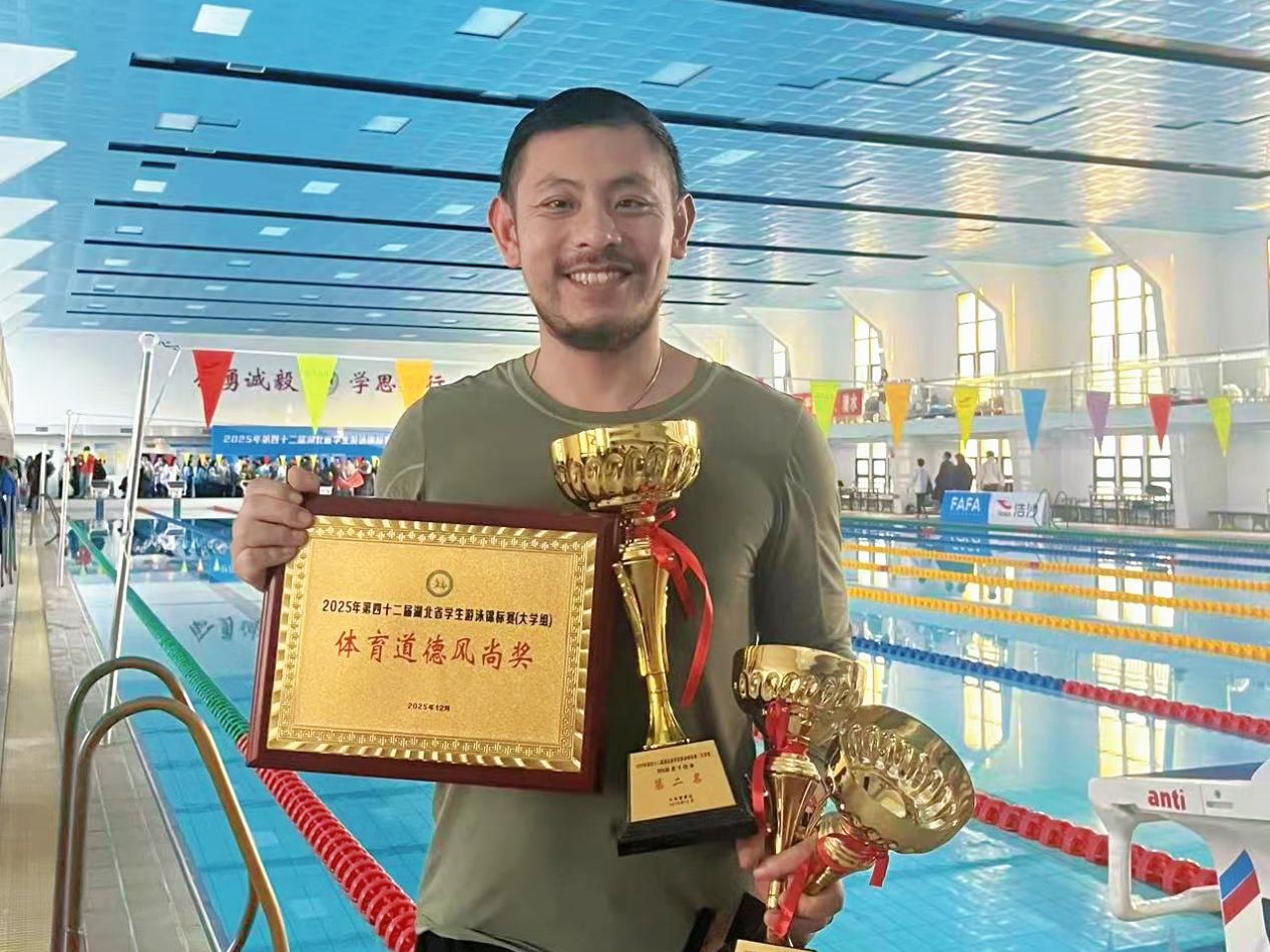 2025年12月26日,第四十二届湖北省学生游泳锦标赛(大学组)在武汉体育学院圆满落幕。湖北恩施学院派出11名学子组成的代表队,在高海老师的悉心指导下奋勇争先,最终斩获5金7银6铜的优异成绩,同时拿下男子丙B组团体总分第二名、女子丙B组团体总分第三名,还被赛事组委会授予“体育道德风尚奖”,实现“人人有奖牌、项项有名次”的参赛目标,生动诠释了学校“五育并举”的育人理念和体育育人的扎实成效。