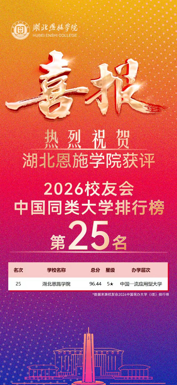 1月12日,备受瞩目的艾瑞深校友会2026中国大学排名正式发布。湖北恩施学院在中国民办大学排名(Ⅰ类)中再上新台阶,上升至全国第25名,较上年排名提升4位,稳居全国30强之列,获评5星级中国一流应用型大学。这一显著进步,标志着学校在高质量应用型大学的建设道路上实现了新的跨越,综合办学实力获得了权威认可。