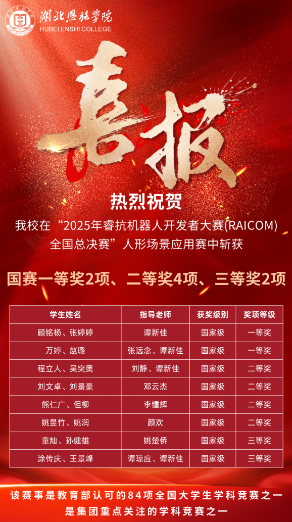 近日,2025年睿抗机器人开发者大赛(RAICOM)全国总决赛人形场景应用赛圆满落幕。湖北恩施学院参赛团队在全国多所高校的激烈角逐中脱颖而出,一举斩获国家级一等奖2项、二等奖4项、三等奖2项,共计8项国家级大奖。这一亮眼成绩既是学校“以父母之心育人,帮助学生成就梦想”办学宗旨的生动践行,更是“立德树人,因材施教,学以致用”教育理念与“正德至善、为学至精”校训精神的鲜活印证,充分彰显了学校高质量应用型人才培养的扎实成效。